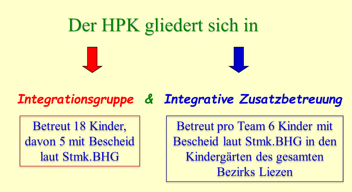 Die Organisation des Heilpädagogischen Kindergartens gliedert sich in die Integrationsgruppe mit seinem Standort in Liezen und die Integrative Zusatzbetreuung (IZB).