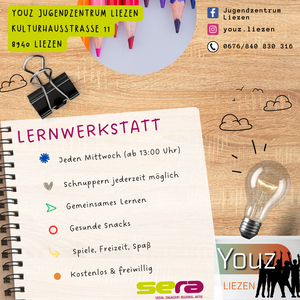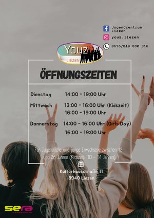 Nähere Informationen (Jugendzentrum Liezen) oder per E-Mail: youz@sera-liezen.at möglich.