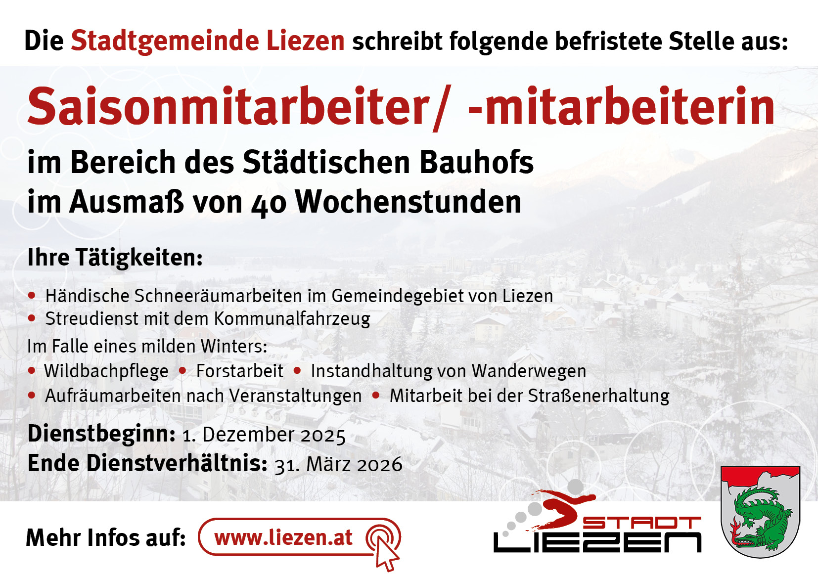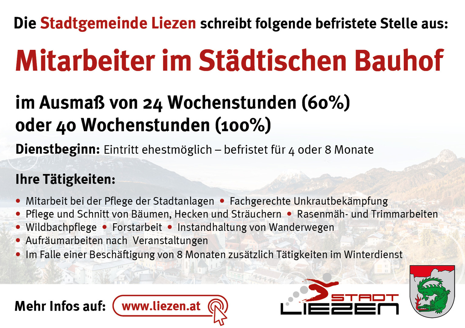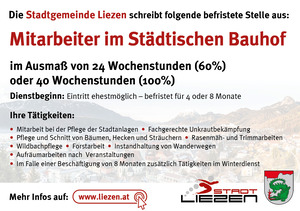 Die Stadtgemeinde Liezen verstärkt ab sofort ihr Team im Städtischen Bauhof um: