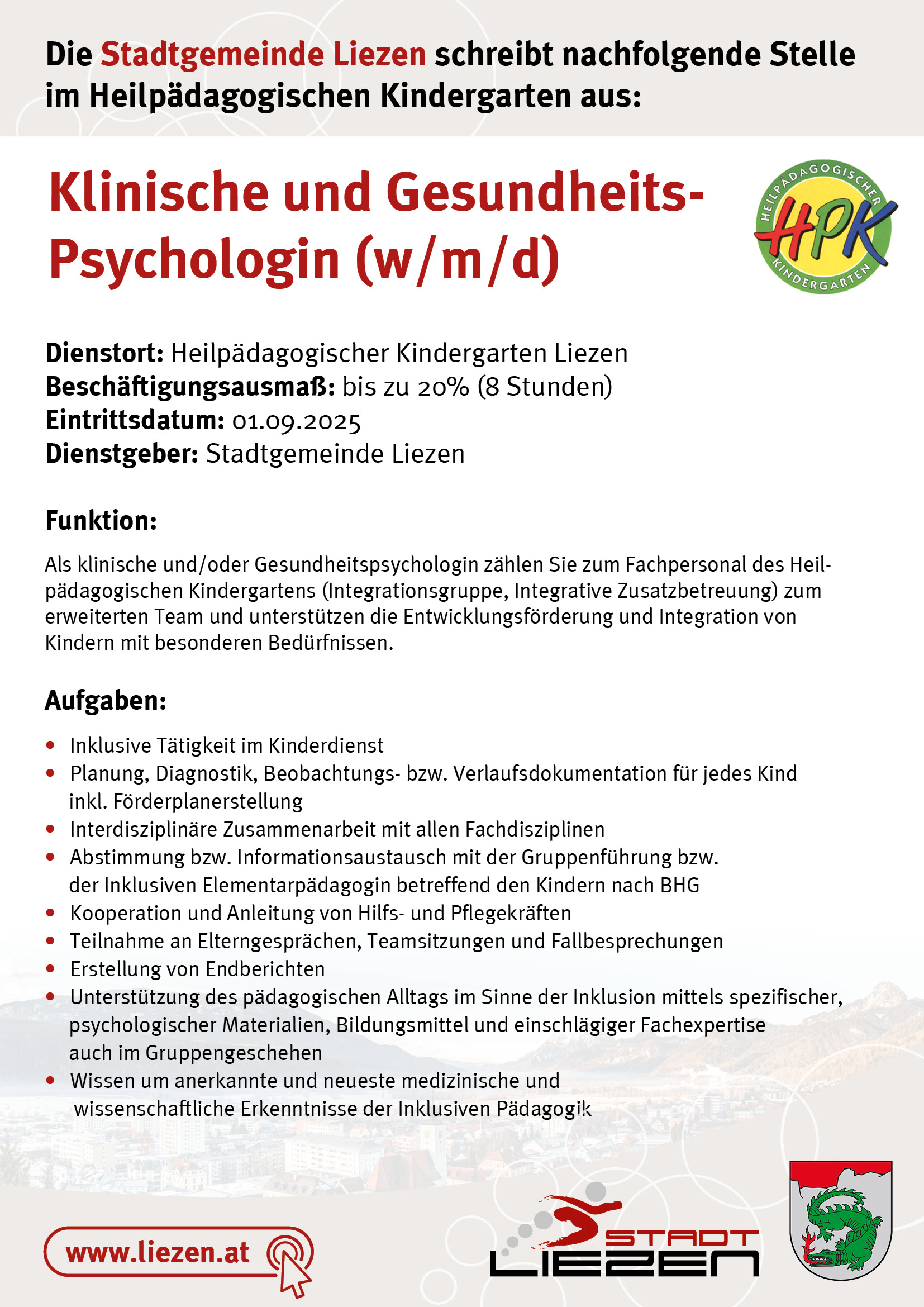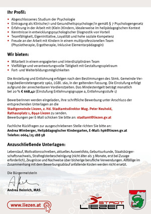 Die Stadtgemeinde Liezen schreibt nachfolgende Stelle im Heilpädagogischen Kindergarten aus:
