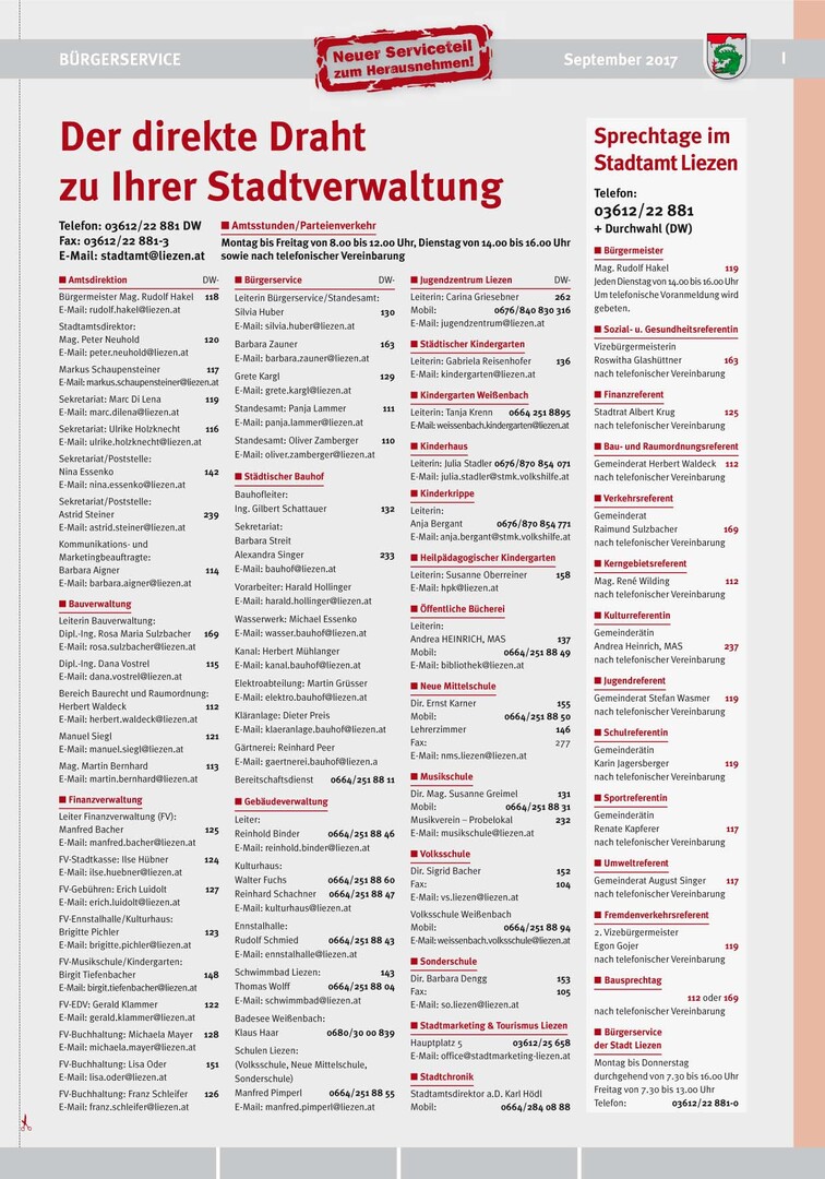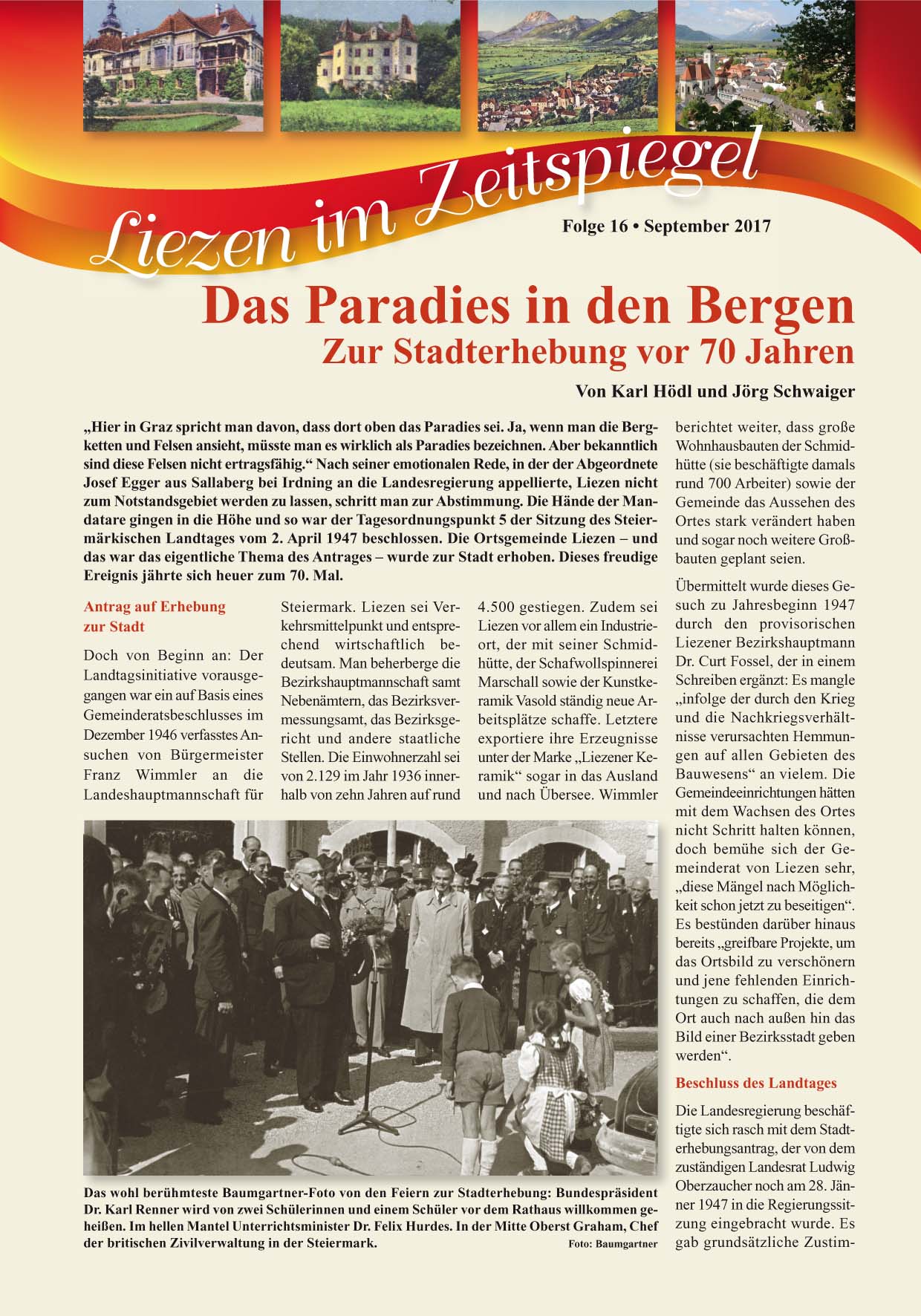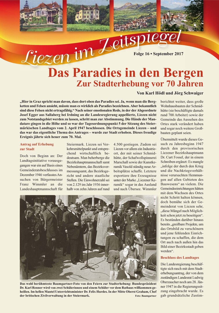 Weiters steht Ihnen im Anhang auch die aktuelle Beilage "Liezen im Zeitenspiegel" online zur Verfügung. Dieses Mal zum Thema "Zur Stadterhebung vor 70 Jahren".