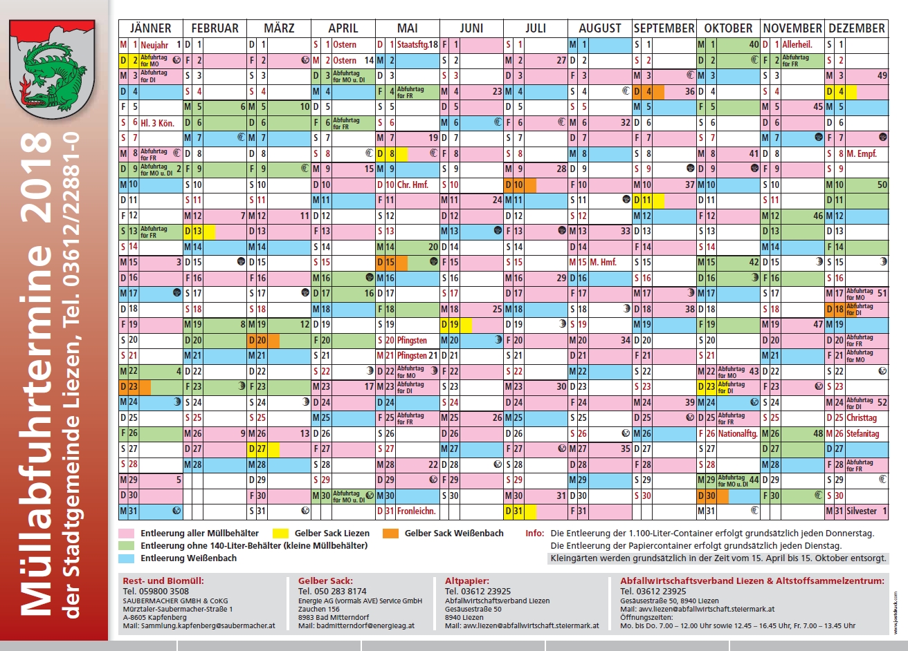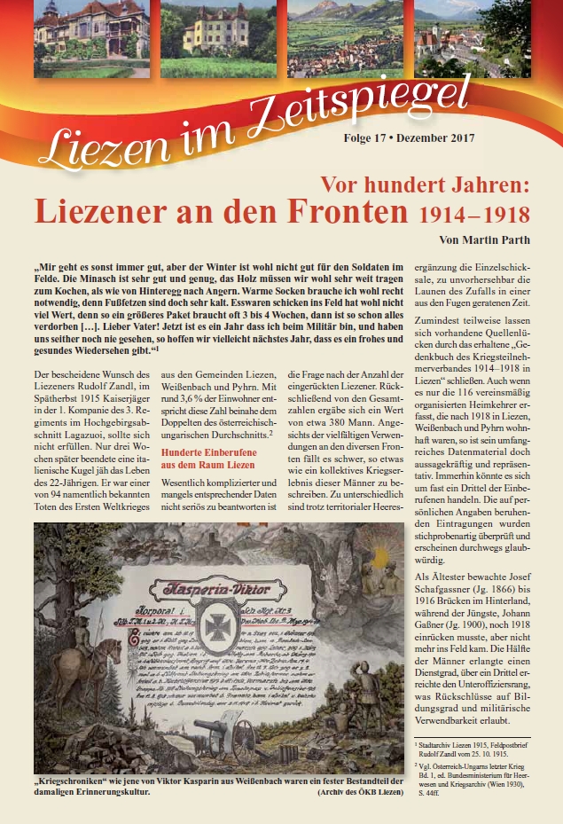Weiters steht Ihnen im Anhang auch die aktuelle Beilage "Liezen im Zeitenspiegel" online zur Verfügung. Dieses Mal zum Thema "Vor hundert Jahren - Liezener an den Fronten 1914-1918! Zusätzlich können Sie auch Abfuhrkalender 2018 downloaden.