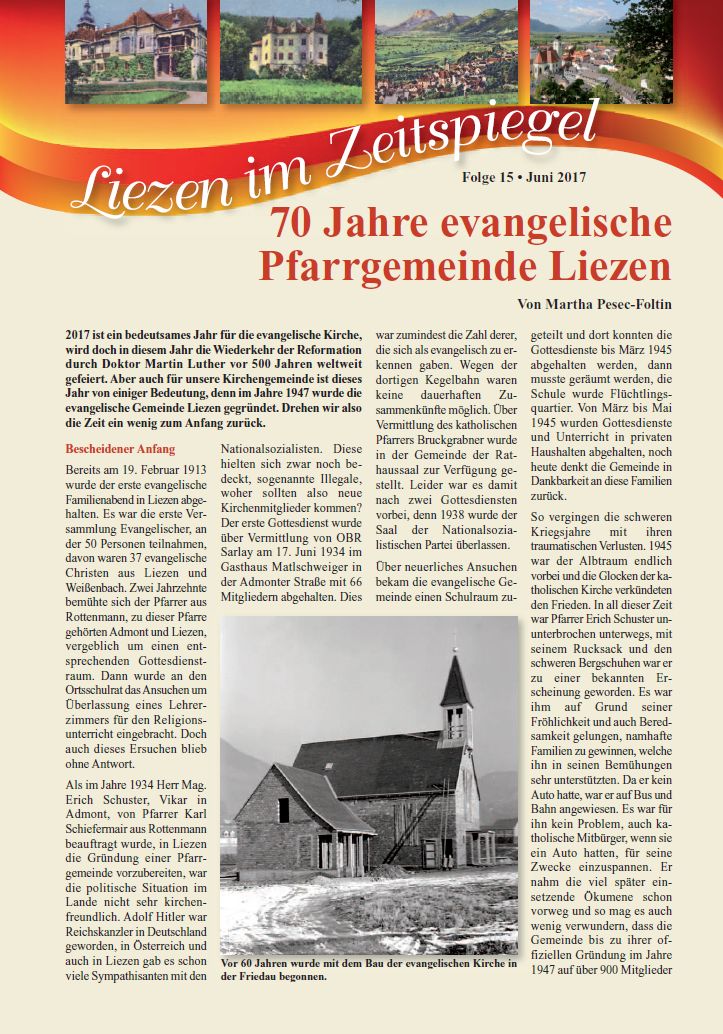 Weiters steht Ihnen im Anhang auch die aktuelle Beilage "Liezen im Zeitenspiegel" online zur Verfügung. Dieses Mal zum Thema "70 Jahre Evangelische Pfarrgemeinde Liezen".